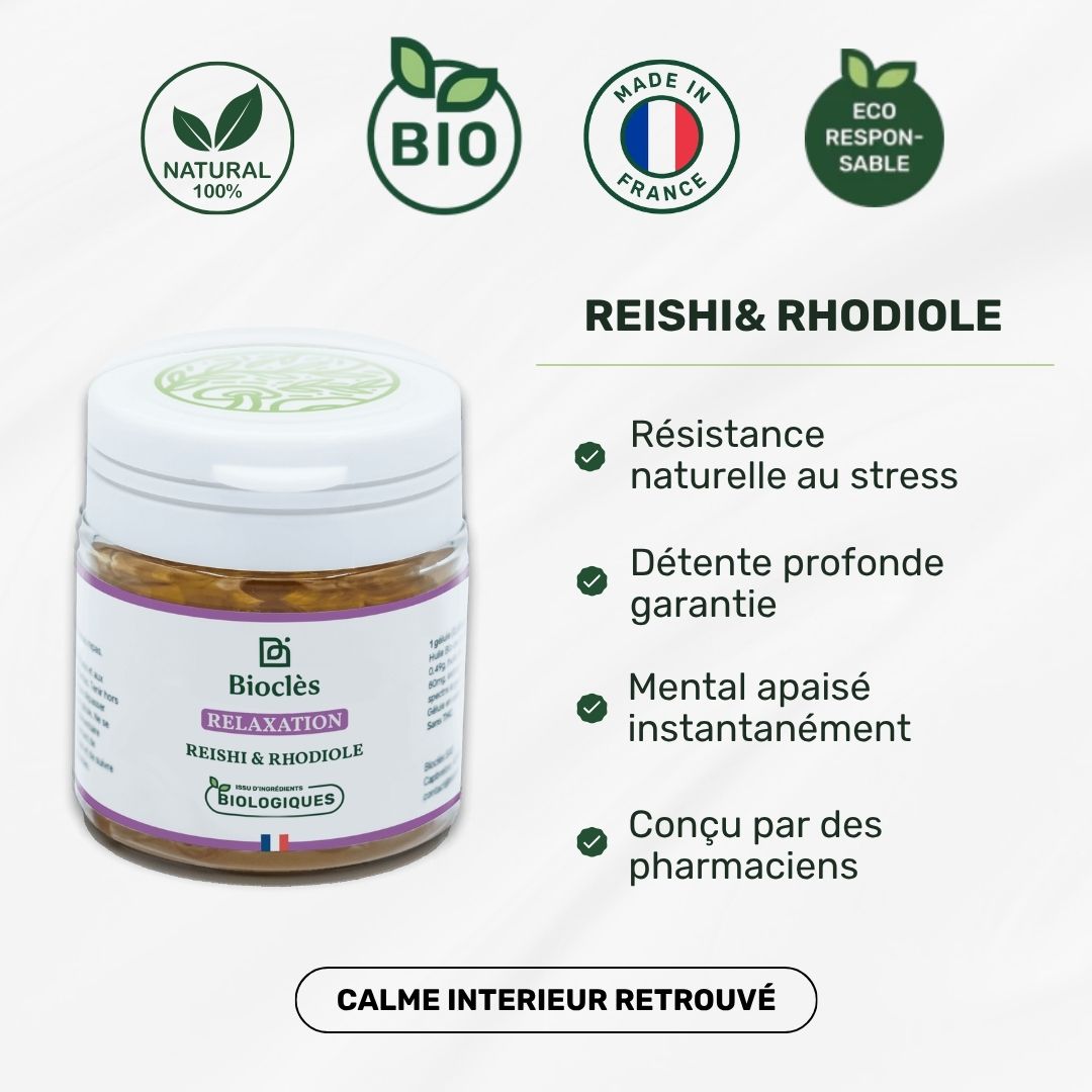 Les gélules Relaxation Bioclès associent le champignon Reishi (Ganoderma lucidum), reconnu pour son effet apaisant sur le système nerveux, à la Rhodiole, plante adaptogène qui soutient l’équilibre émotionnel et réduit la sensation de stress.